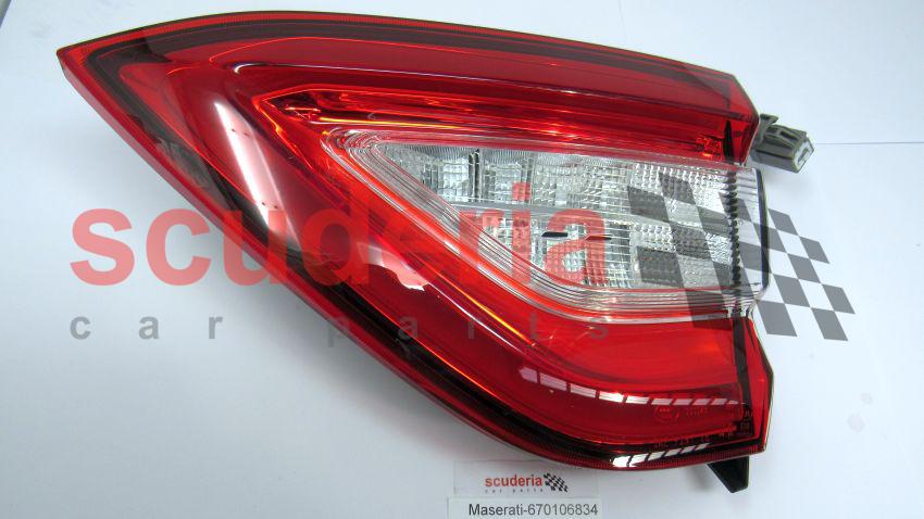 Maserati-Teilenummer 670106834 ist ein rechtsseitiges (RH) Rücklicht für den Maserati Levante. Es befindet sich auf der rechten Seite des Fahrzeughecks und dient folgenden Zwecken: